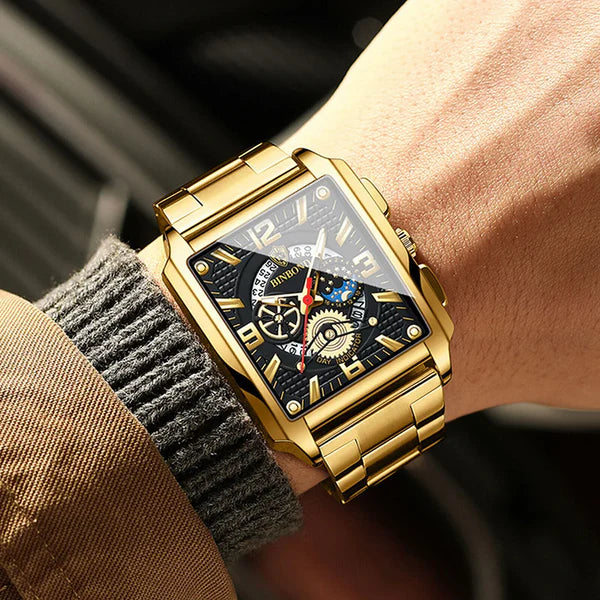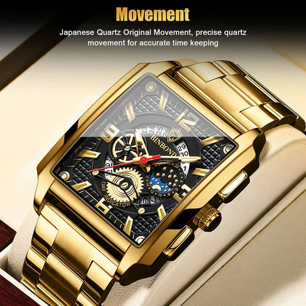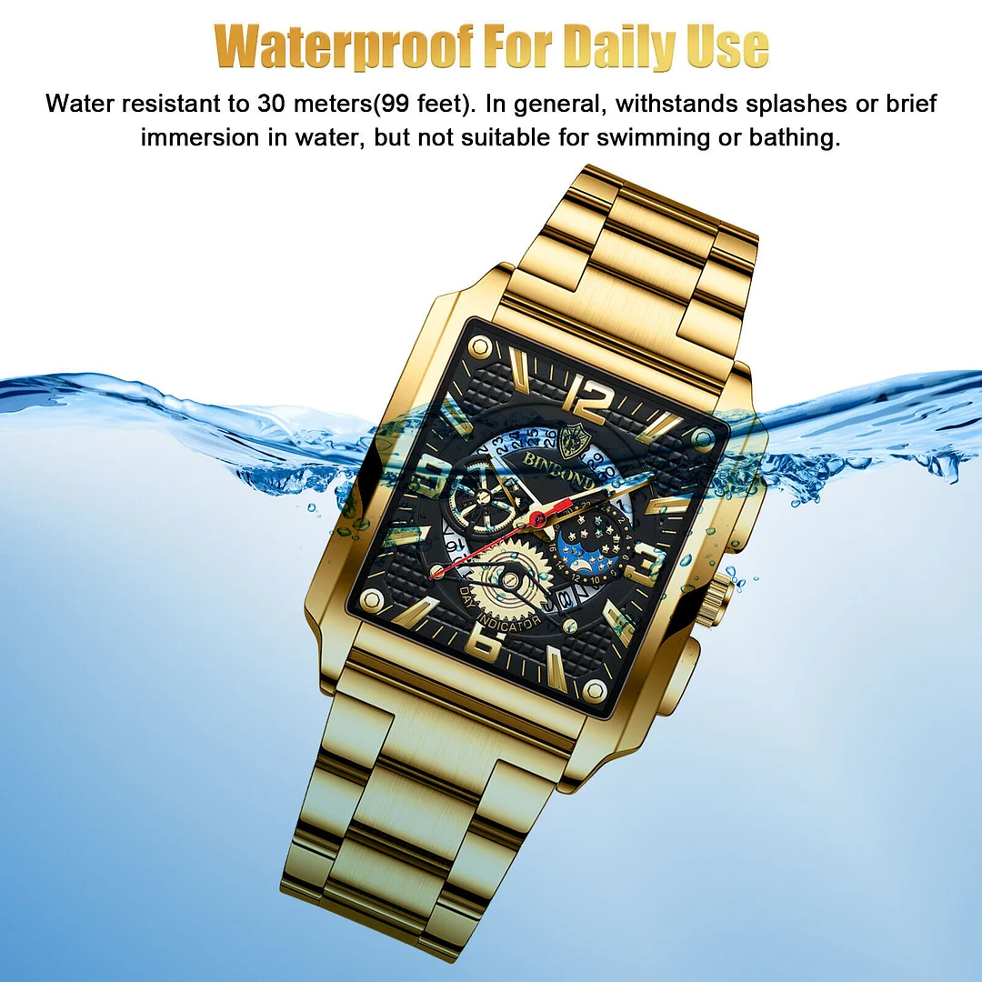 Klocka i rostfritt stål: Trendig fyrkantig guldfärgad boett, perfekt kombination av fritid och stil, enkel och elegant. Passar perfekt på handleden, är bekväm att bära och armbandet är andningsbart och vattentätt.