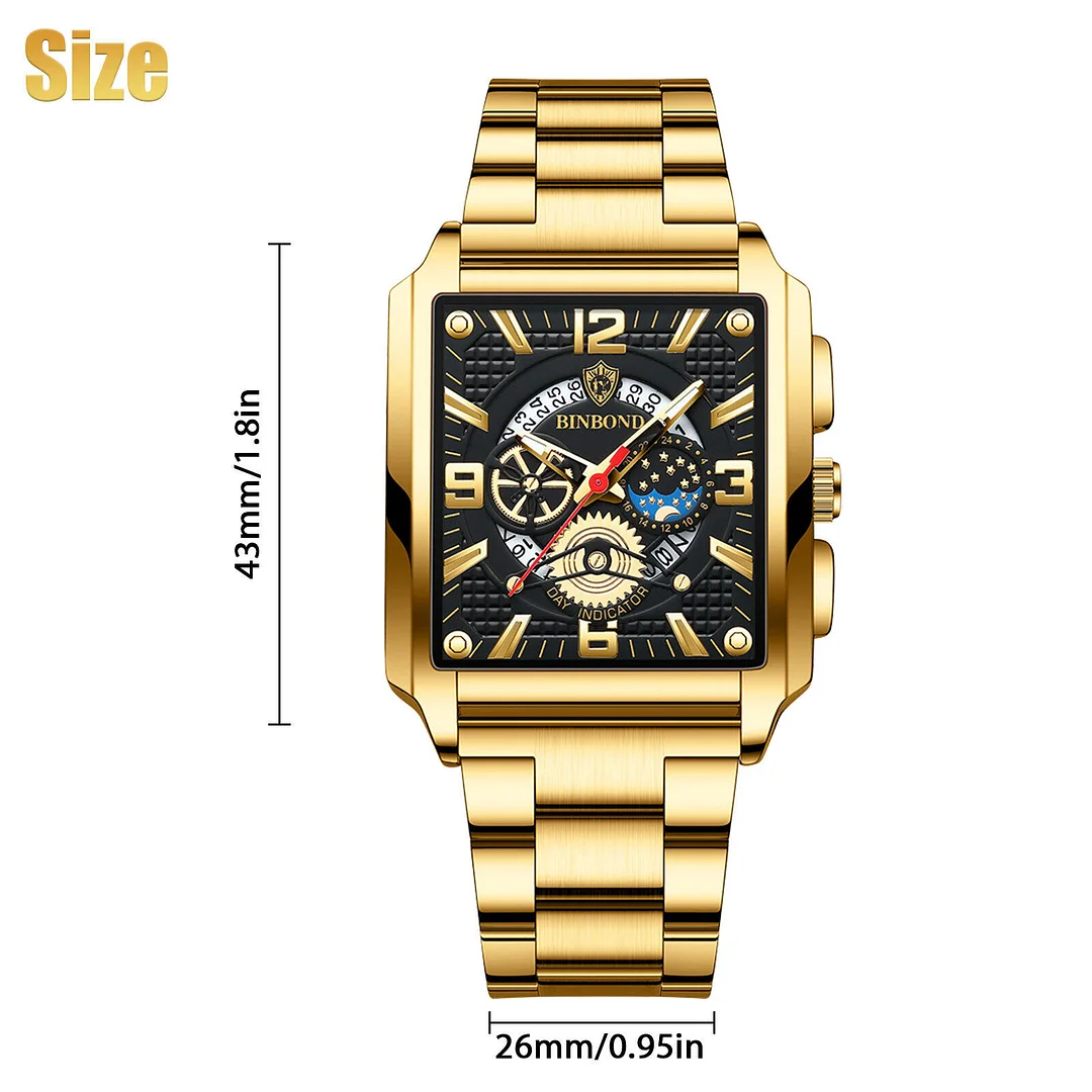 Klocka i rostfritt stål: Modern fyrkantig guldfärgad boett, som är en perfekt kombination av fritid och business, enkel och elegant. Passar perfekt din handled, är bekväm att bära och materialet i armbandet är andningsbart och vattentätt. Analoga kvartsur: Originalt kvartsurverk och högkvalitativt batteri gör tiden mer exakt. Noggrann tidtagning, batteritid upp till 3 år, hållbart. Batteriet är också enkelt att byta ut. Vattentät, belyst och kalenderarmbandsur: Vattentät upp till 30 meter, resistent mot svett, regn eller vattenstänk. Visaren har en belysningsfunktion som kan lysa upp i mörka miljöer och ett praktiskt datumfönster. Produktdetaljer: Typ: Herrkvartsur Urverk: Kvartsurverk Färg: Guld Klockdiameter: 43 mm Klocktjocklek: 12 mm Armbandsbredd: 26 mm Armbandslängd: 260 mm Material: Rostfritt stål Vattentålighet: 30 m Funktioner: Kalender/Lysande/Vattentålig